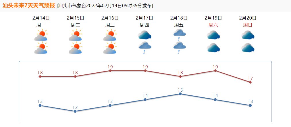 预计,受冷空气和切变线影响,今天(13日)夜间我市有小雨降水,明天(14日)逐渐转为阴天到多云天气,15-16日多云间晴为主。雨天路滑,能见度低,外出需注意交通安全。早晚气温低,需注意防寒保暖。汕头附近海面东北风7级阵风8级。海面风力大,海岛旅游和海上交通需注意安全。