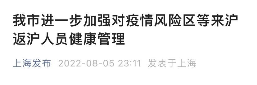 2022年8月5日,上海市疫情防控工作领导小组办公室发布通知:根据疫情防控有关要求,我市进一步加强对疫情风险区等来沪返沪人员健康管理,具体措施如下: