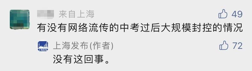 2022年7月11日,有网友在上海发布留言区提问,“有没有网络流传的中考过后大规模封控的情况?” 对此,上海发布回应称,“没有这回事”。