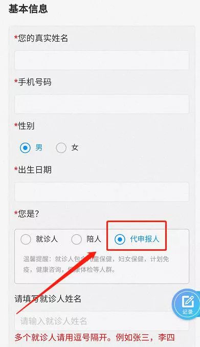 5.若您无法自行填写,可由亲友、工作人员代填写。填写代申请人的基本信息后身份选择“代申报”,填写就诊人姓名、联系方式即可进行代申报。