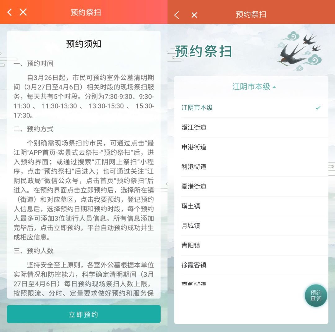 预约方式:通过“江阴网上祭扫”平台,点击“预约祭扫”模块,如实填报相关信息,进行网上预约。预约祭扫实行提前预约,每天设定预约数量上限,限量预约、约满为止。非预约不得赴现场进行祭扫。各镇街民政办、各室外墓区指派专人负责做好祭扫预约的操作指导工作。