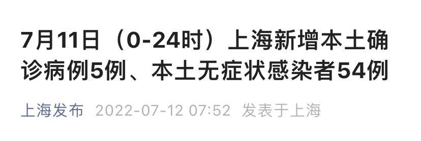 上海市卫健委7月12日通报:2022年7月11日0—24时,新增本土确诊病例5例和无症状感染者54例,其中4例确诊病例和52例无症状感染者在隔离管控中发现,1例确诊和2例无症状在风险人群筛查中发现,详情如下。