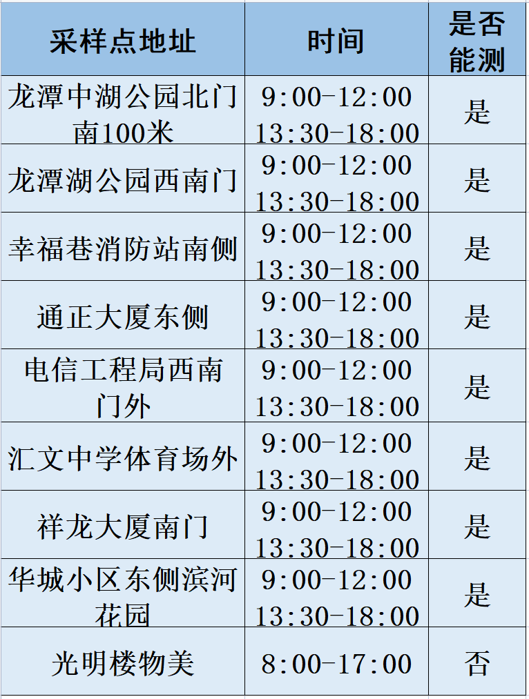 2. 华城小区东侧滨河花园核酸检测时间为:上午9:00-12:00、下午13:30-18:00