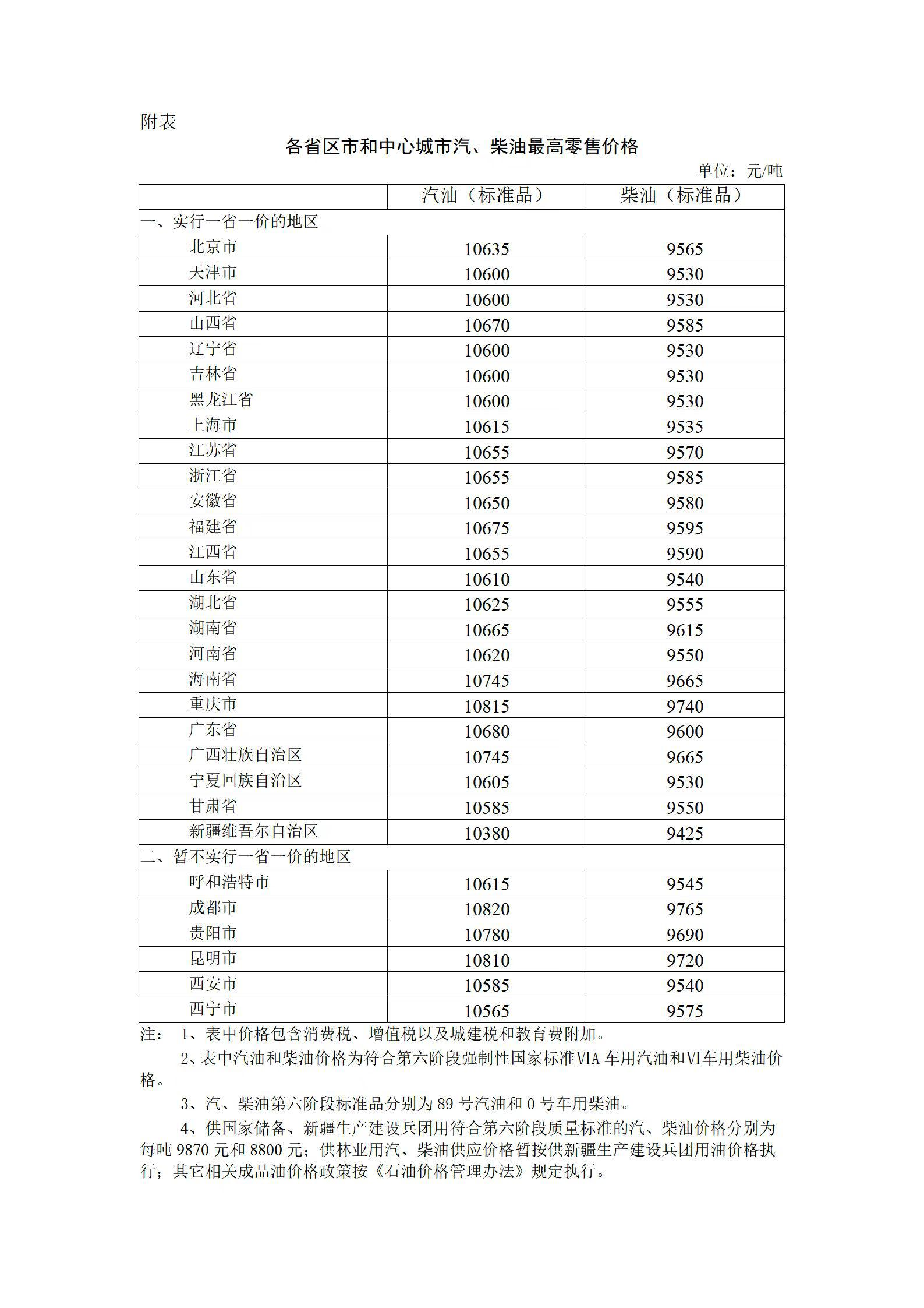 附:各省区市和中心城市汽、柴油最高零售价格