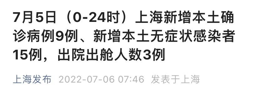 上海市卫健委7月6日通报:2022年7月5日0—24时,新增本土新冠肺炎确诊病例9例和无症状感染者15例,均在隔离管控中发现。