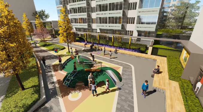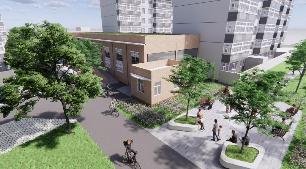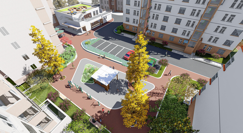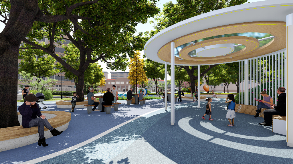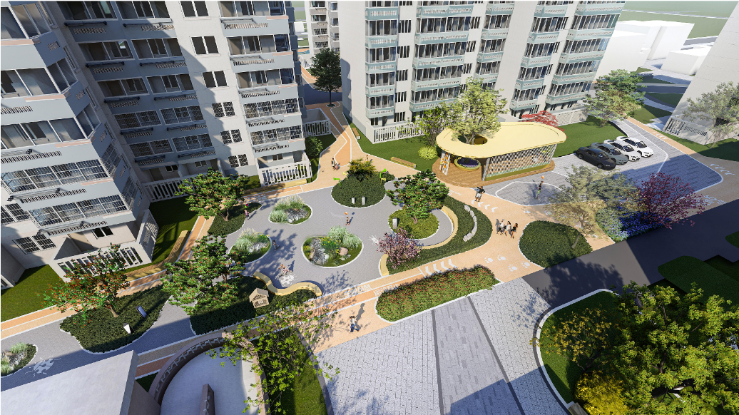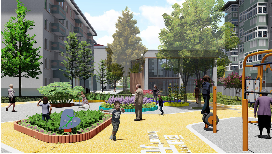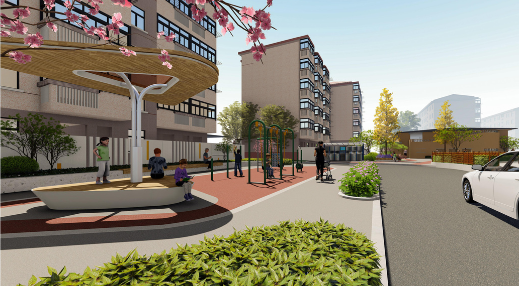 中心绿地保留原有的健身、晾晒、休憩功能,重新规划布局,在幼儿园旁边设计儿童游乐区,打造亲子交流空间,提升区域活力。
