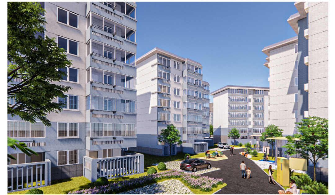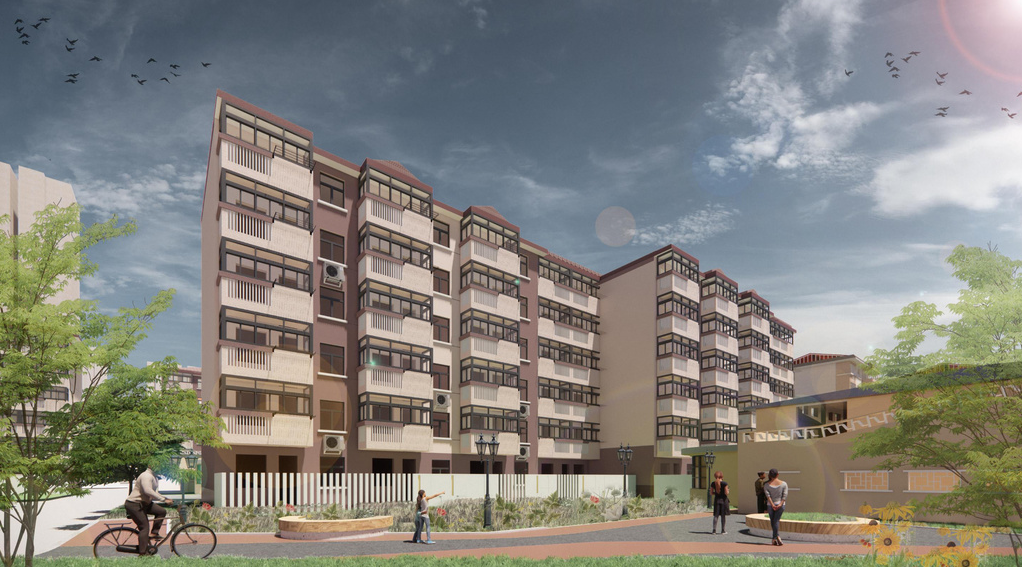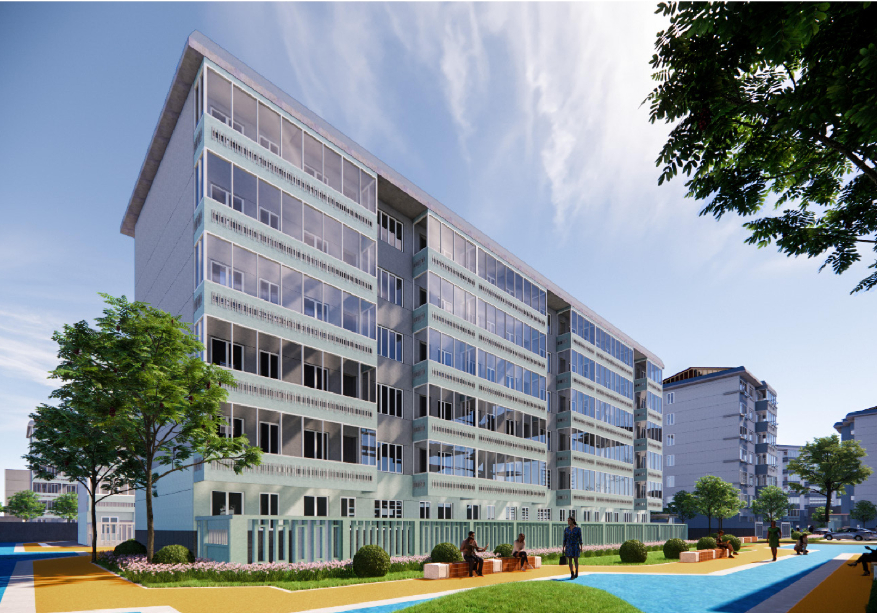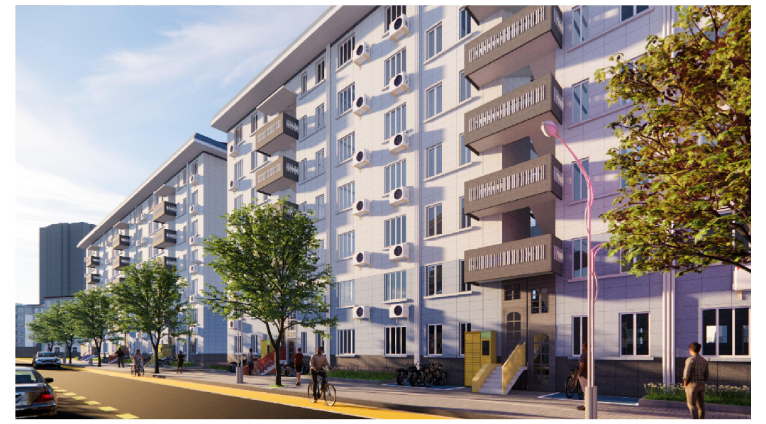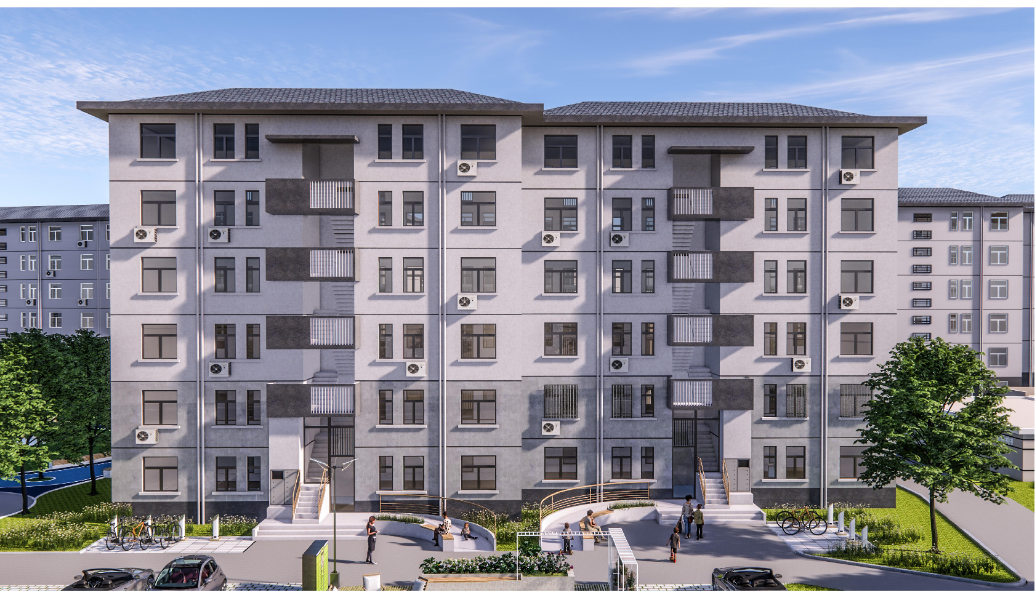 本次改造计划对入户门厅进行简单的修整;对立面重新粉刷;增设无障碍坡道与楼栋底层休息空间;对空调位置进行整理。