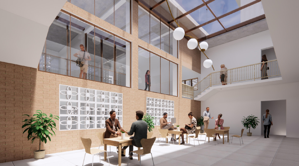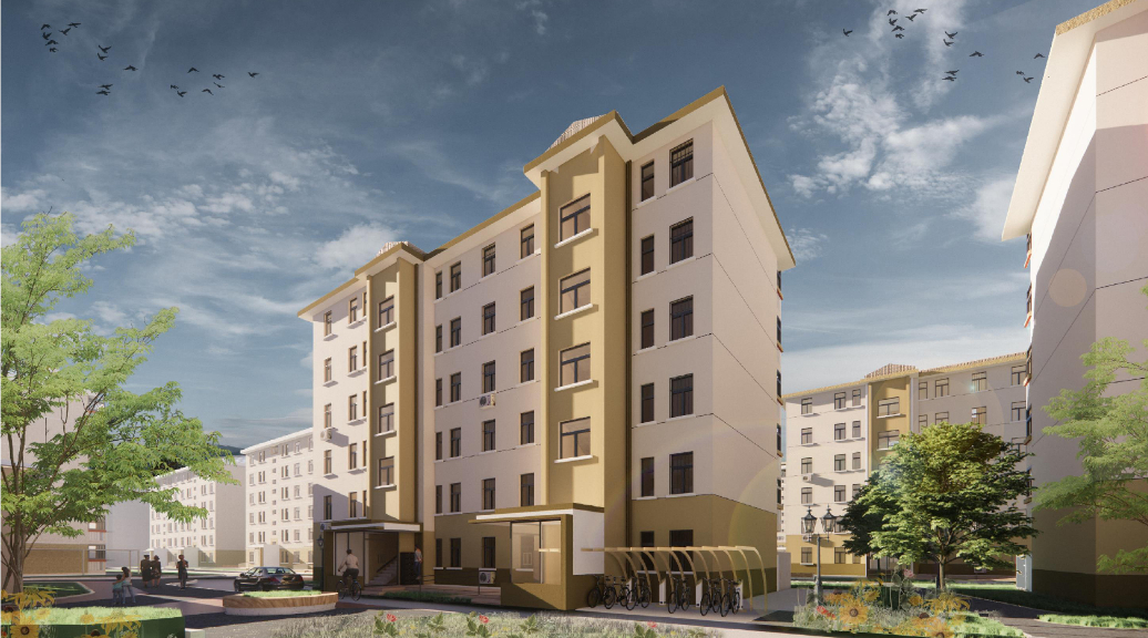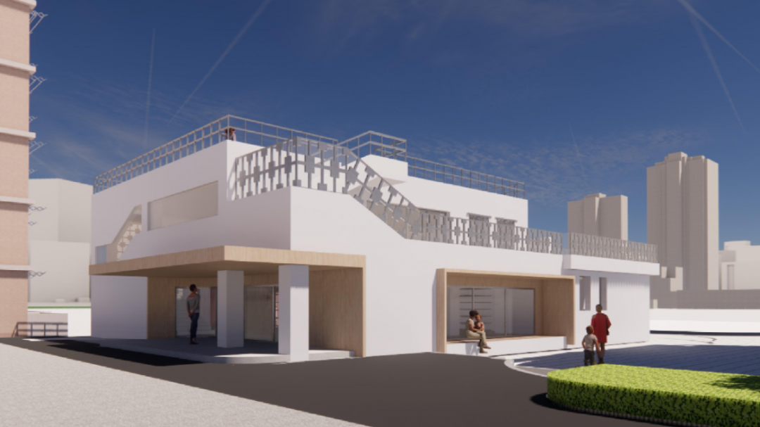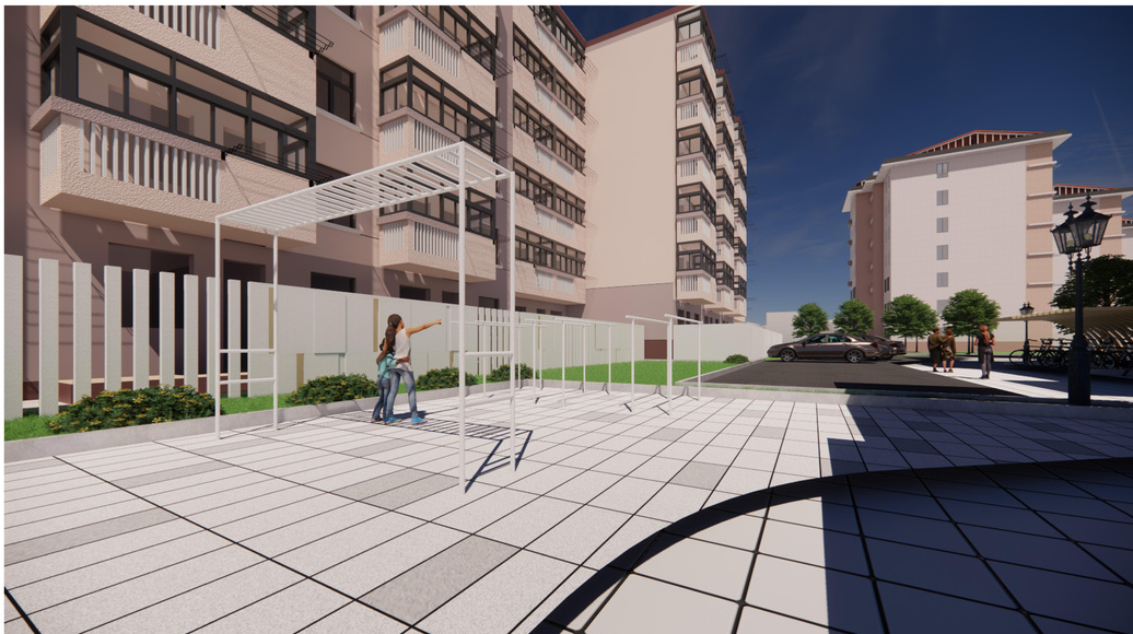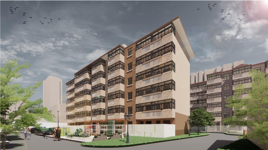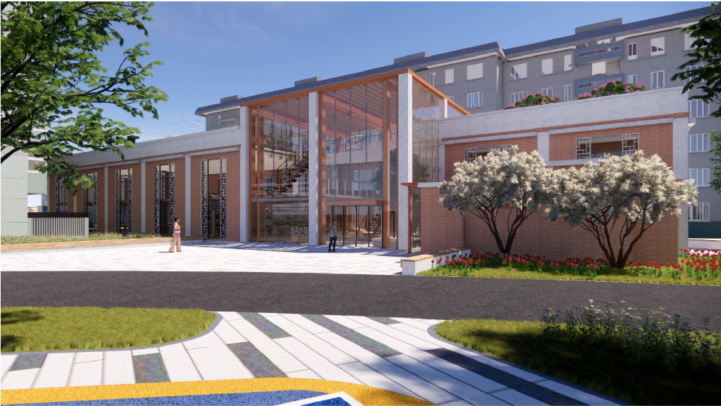 本次改造计划对入户门厅进行简单的修整;对立面重新粉刷;增设无障碍坡道与楼栋底层休息空间;对空调位置进行整理。