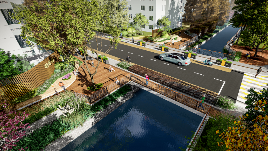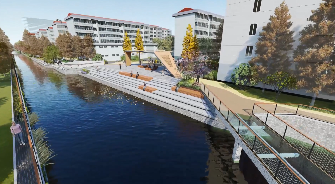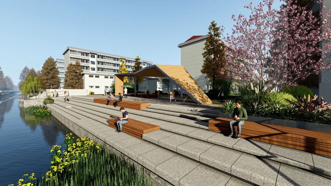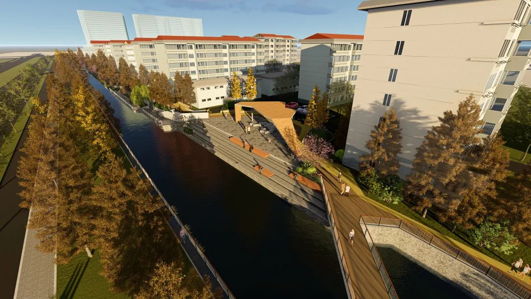 设计结合住区内的绿地及改造的自行车库,打造不同功能的主题节点,如稻香路入口区、滨水休闲广场、滨水商业广场等,用散步道连接各节点。在节点上设置休闲廊架、亲水平台、活动广场等,为居民提供高质量的滨水休闲空间。