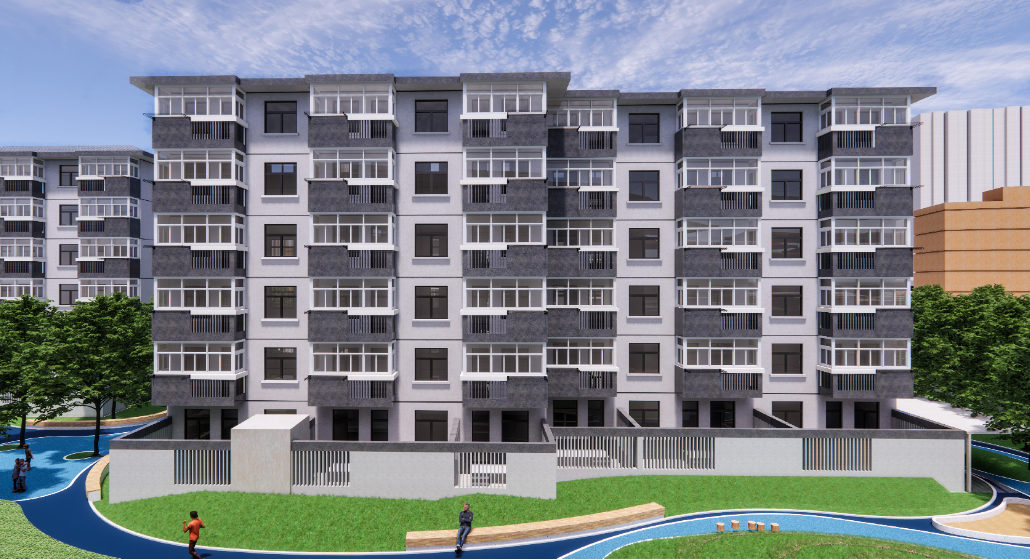 在建筑南立面中,对立面进行重新粉刷,增设每个阳台的晾晒架;同时对围墙进行粉刷。