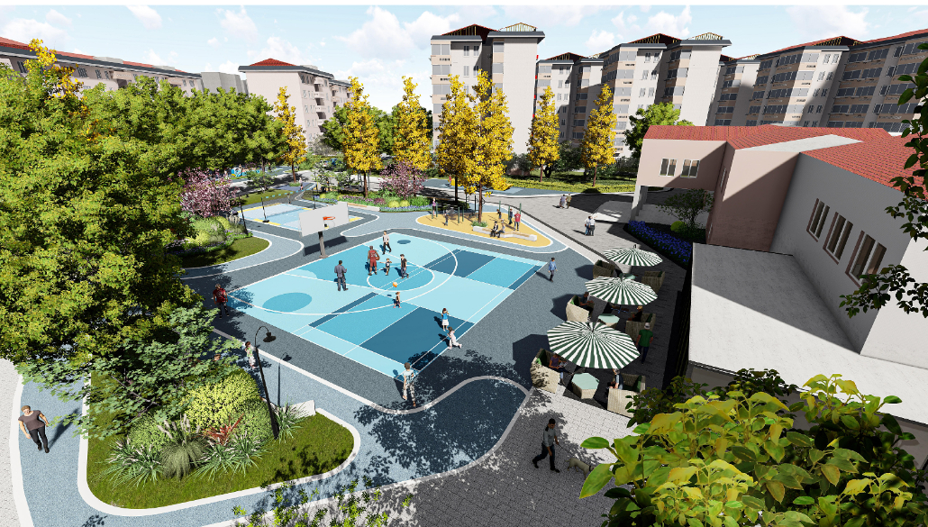 景观设计规划采用暖黄色彩色沥青散步道串联绿化空间,打造居民休闲绿廊;以文化中心为核心景观打造体育健身特色广场,填补稻香社区运动球场的空缺;打造老年活动空间、邻里交流空间、全龄活动空间,丰富不同年龄段的活动场地。