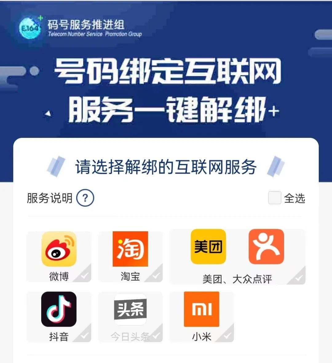 6月8日,工信部直属科研事业单位中国信息通信研究院上线了手机号“一键查询”与“一键解绑”服务,可以查询手机号注册的互联网账户情况,并提供微博、淘宝、抖音和美团等解绑服务。