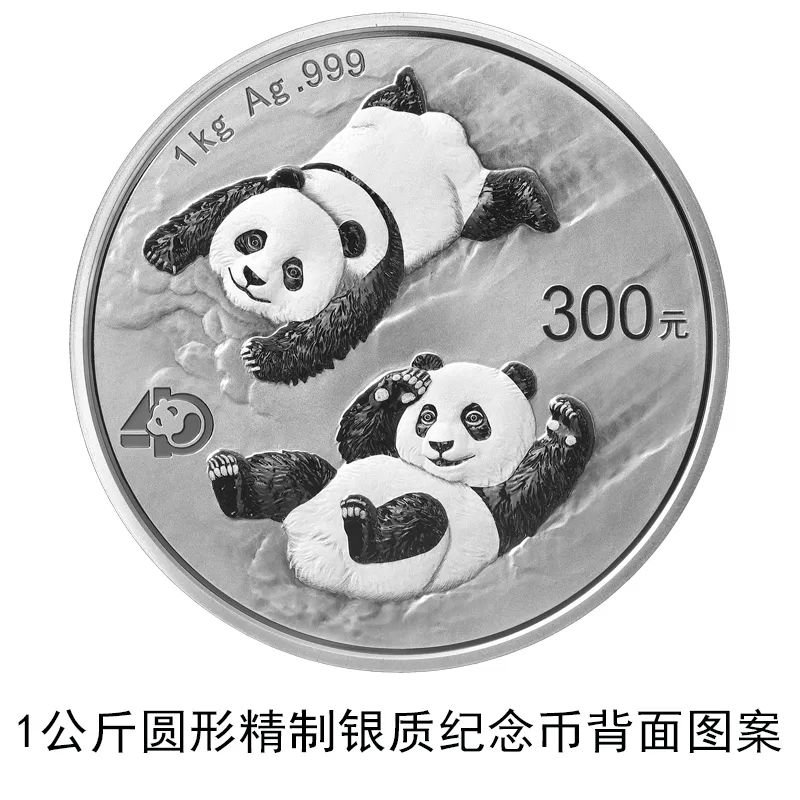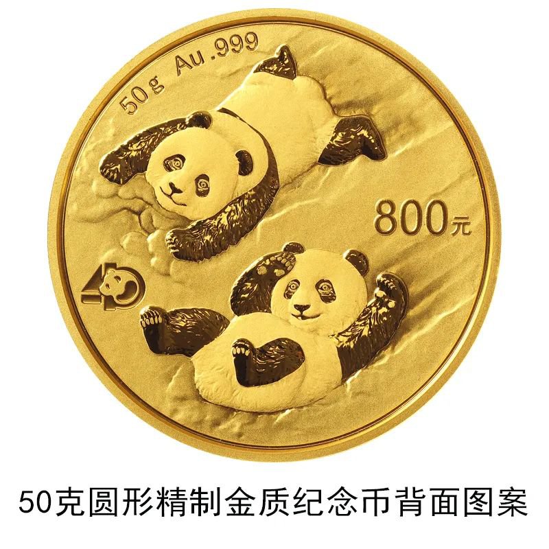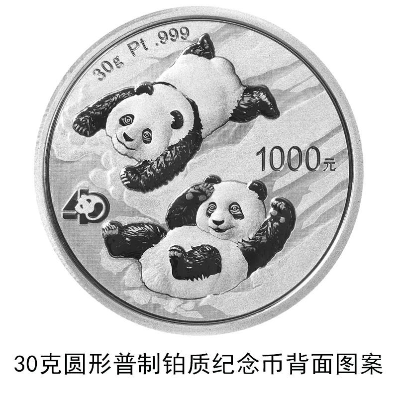 该套贵金属纪念币正面图案均为北京天坛祈年殿,并刊国名、年号;背面图案均为大熊猫滑雪嬉戏场景,辅以“熊猫金币发行40周年标识”元素,并刊面额、重量及成色。