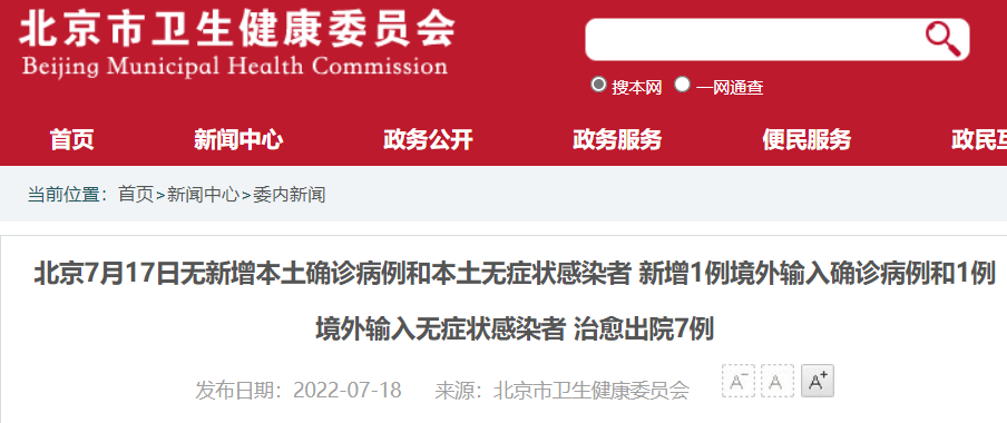 7月17日0时至24时,无新增本土确诊病例、疑似病例和无症状感染者;新增1例境外输入确诊病例和1例无症状感染者,无新增疑似病例。治愈出院7例。