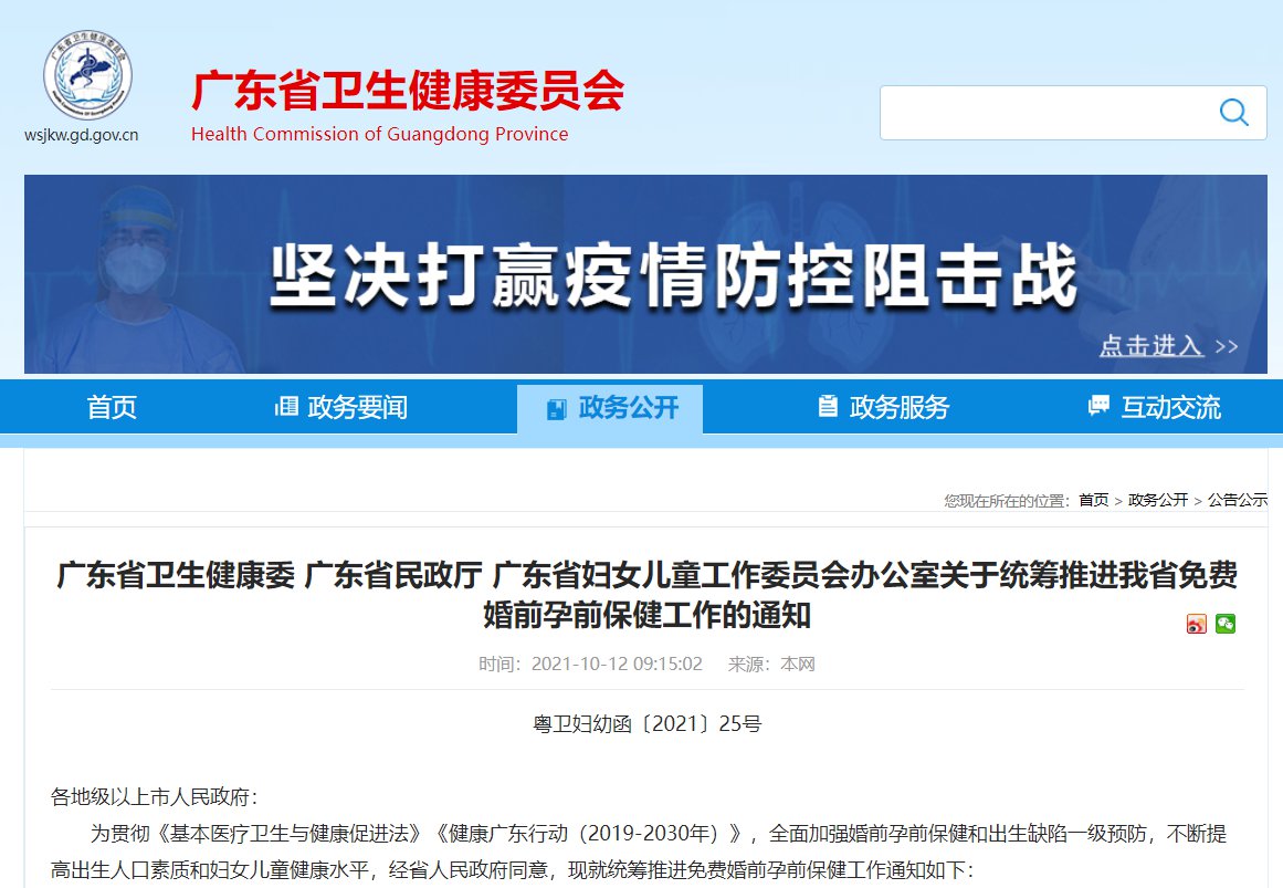 10月12日,广东省卫生健康委、省民政厅、省妇女儿童工作委员会办公室联合发布了《统筹推进免费婚前孕前保健工作通知》(以下简称《通知》),以全面加强婚前孕前保健和出生缺陷一级预防,不断提高出生人口素质和妇女儿童健康水平。