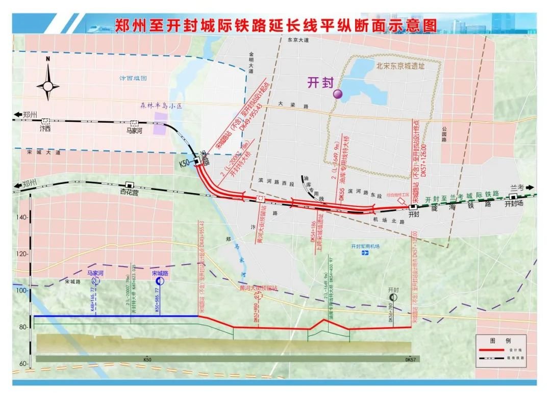 现有郑开城际铁路由郑州东站至宋城路站,2014年12月28日建成通车,2021年10月26日开启“公交化”运营,基本实现了来往郑开两地“随到随走”。郑开城际铁路延长线是郑开城际铁路的组成部分,全线位于开封市区内,起于郑开城际铁路宋城路站,沿陇海铁路北侧东行,止于既有陇海铁路开封站,全线长度7.17公里,设计时速200公里,其中特大桥2座、中桥2座;改造既有陇海场,新建2台4线城际场,新建开封站房1座12000平方米等。修改初步设计概算约22.4亿元,建设工期3年。