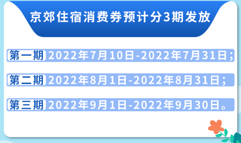 京郊住宿消费券预计分3期发放,第一期7月10日至7月31日;第二期8月1日至8月31日;第三期9月1日至9月30日。