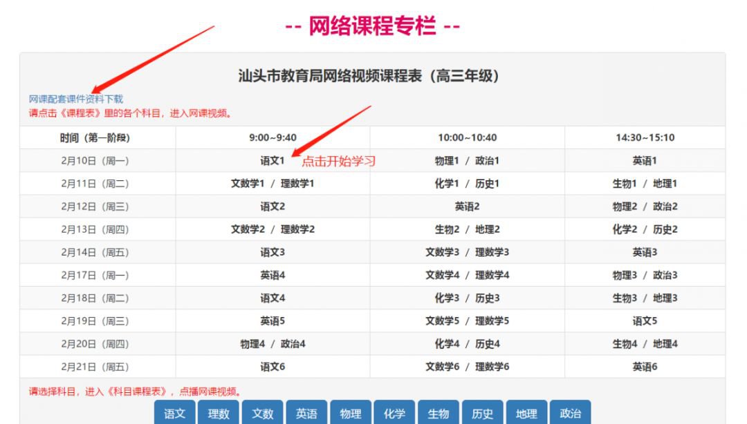 点击网络课程专栏对应的学段,进入各年级《网络课程表》和《科目课程表》