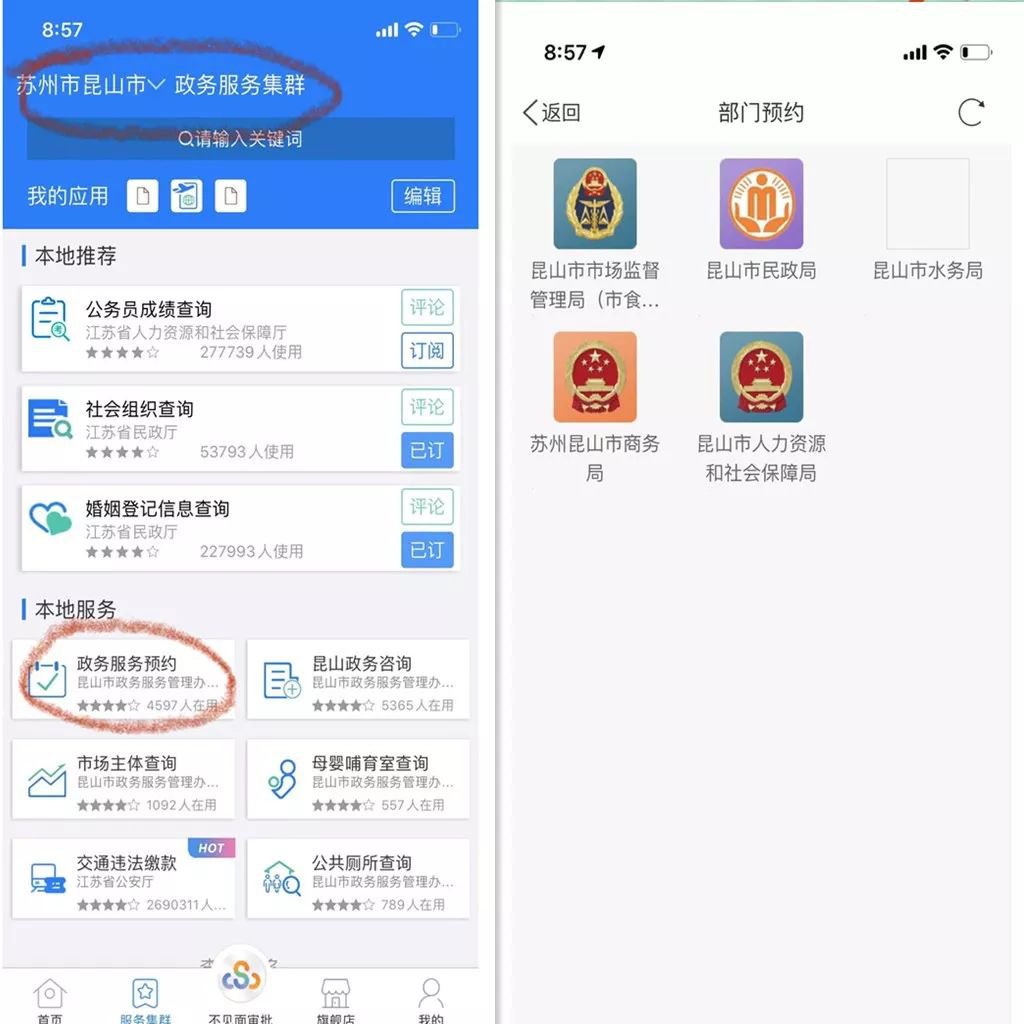 进入“江苏政务服务”手机app,选择“昆山市”站点下的“服务集群”功能,在“本地服务”里选择“政务服务预约”功能,即可在线预约市市场监管局、市民政局、市水务局、市商务局、市人社局等部门事项。