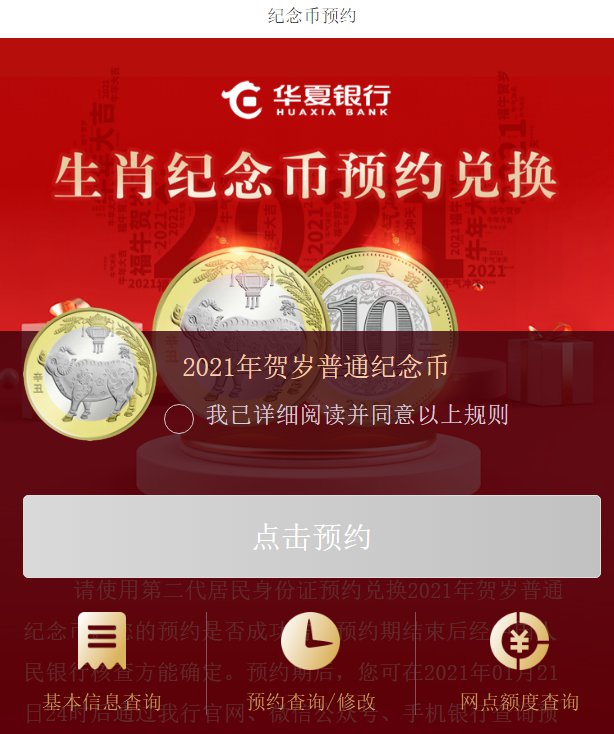 华夏银行2021牛年纪念币的预约入口可以通过如下方式获得: