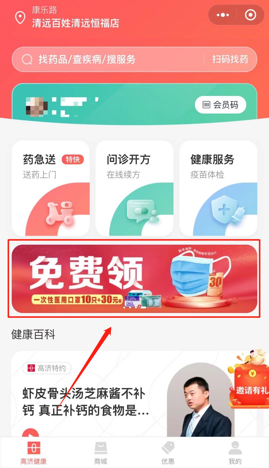 3、点击“去抢券”并确认购买后即可领取免费口罩电子券,可凭电子券到线下门店兑换免费口罩。