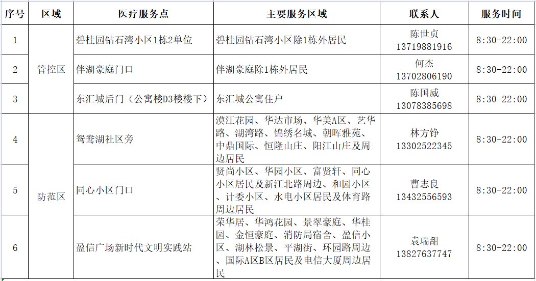 注:1.封控区实行“区域封闭、足不出户、服务上门”管理措施,医疗服务以线上咨询服务、送药上门、上门巡诊和闭环转运服务为主。线上咨询服务热线:0662-3390022(伴湖豪庭小区、盈信小区)、0662-3276276(碧桂园钻石湾小区)。