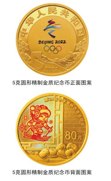 5克圆形金质纪念币背面图案为张家口蔚县剪纸风格滑雪造型,衬以柿子、窗棂等组合设计,并刊“第24届冬季奥林匹克运动会”字样及面额。