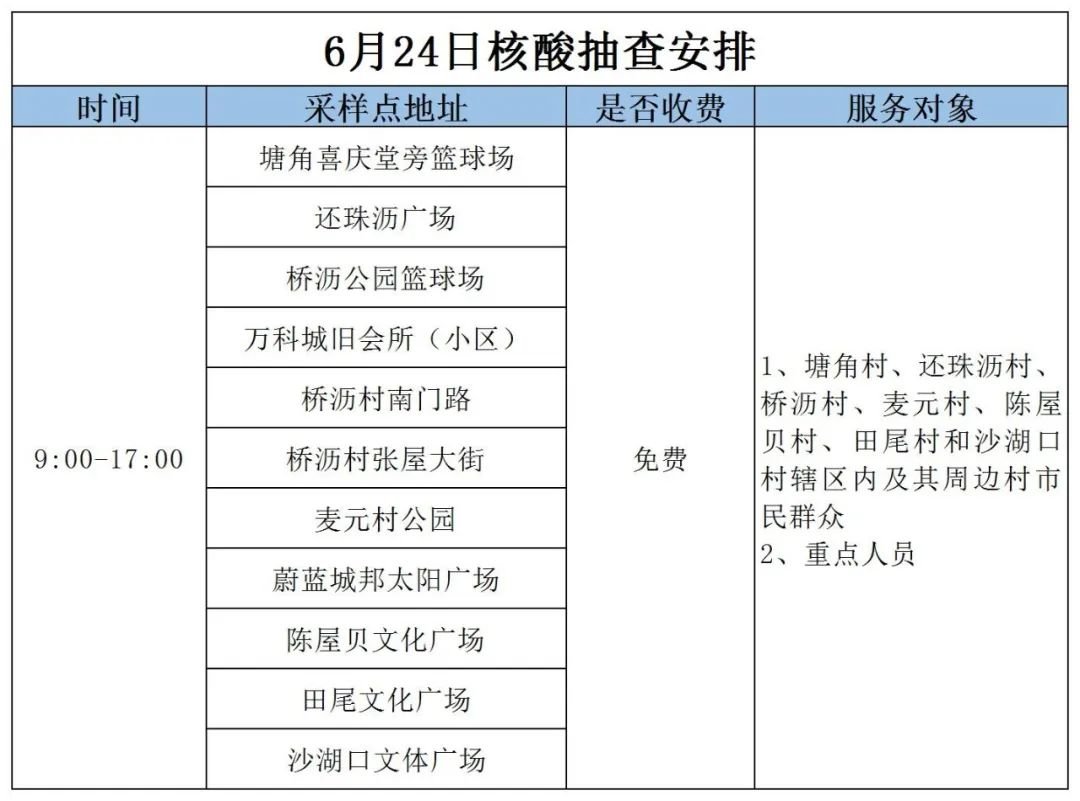为充分发挥核酸检测的“排雷兵”作用和监测预警作用,常平镇开展核酸抽检工作。6月24日安排如下: