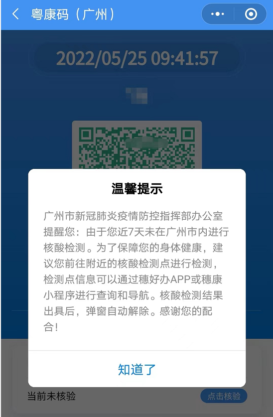 7天未在广州市内进行核酸检测将收到穗康码弹窗提醒