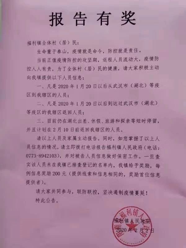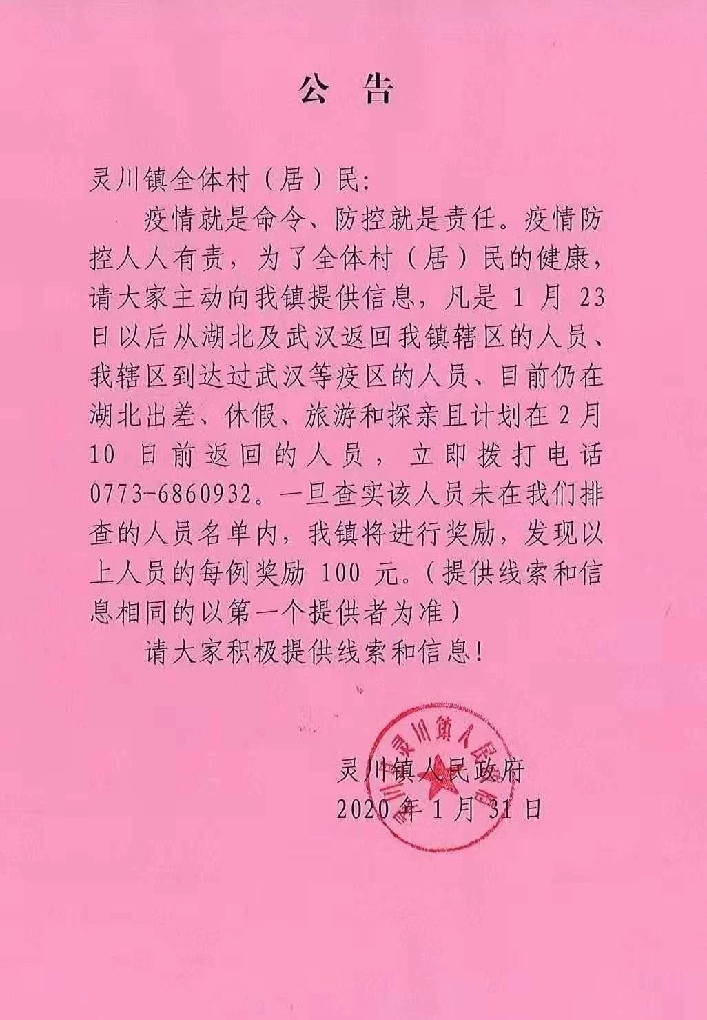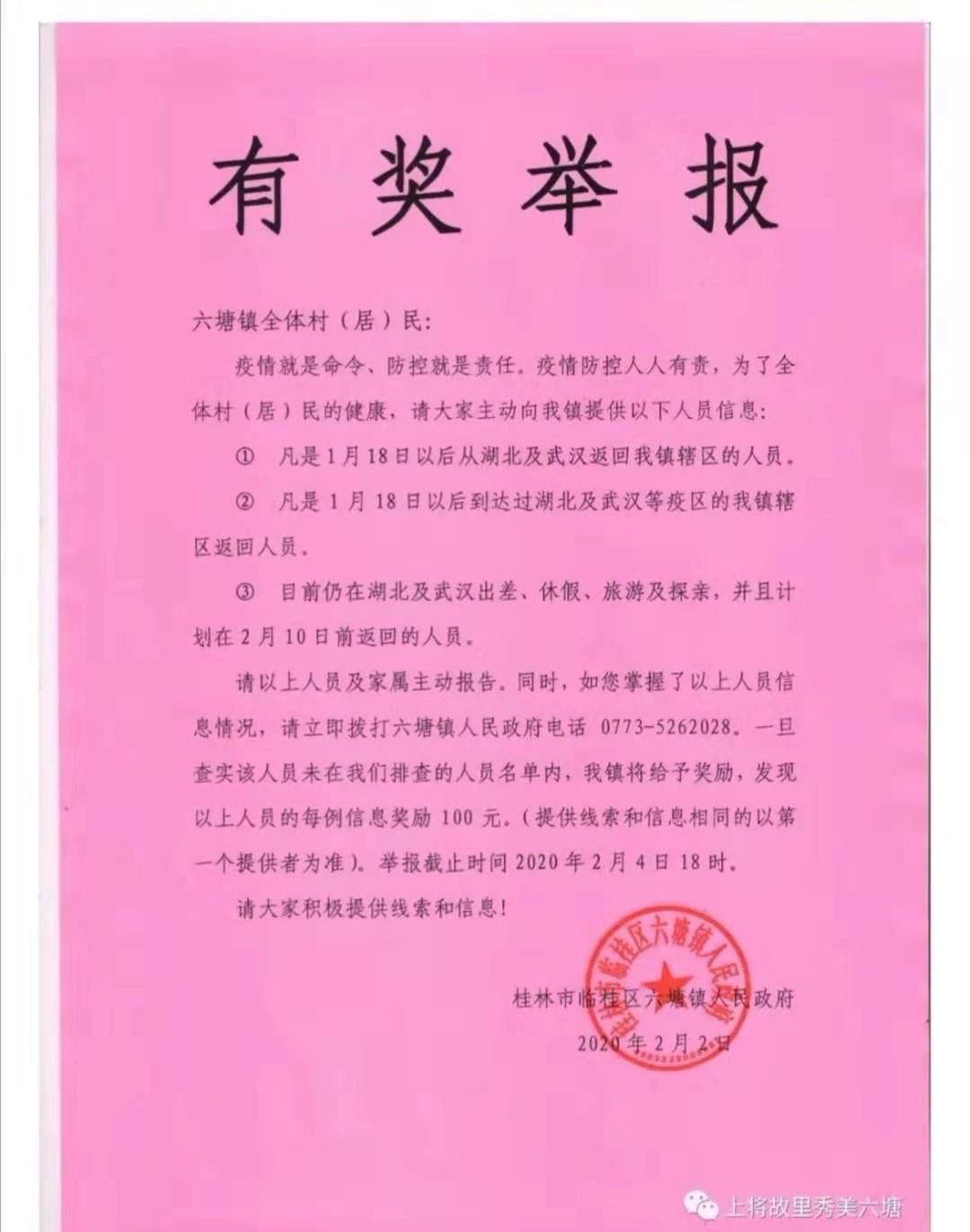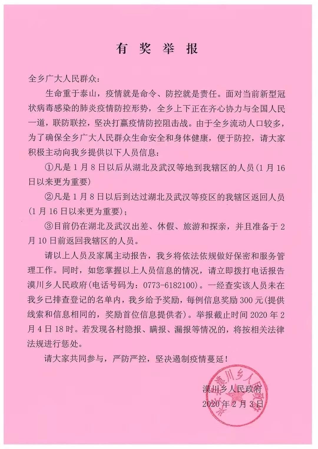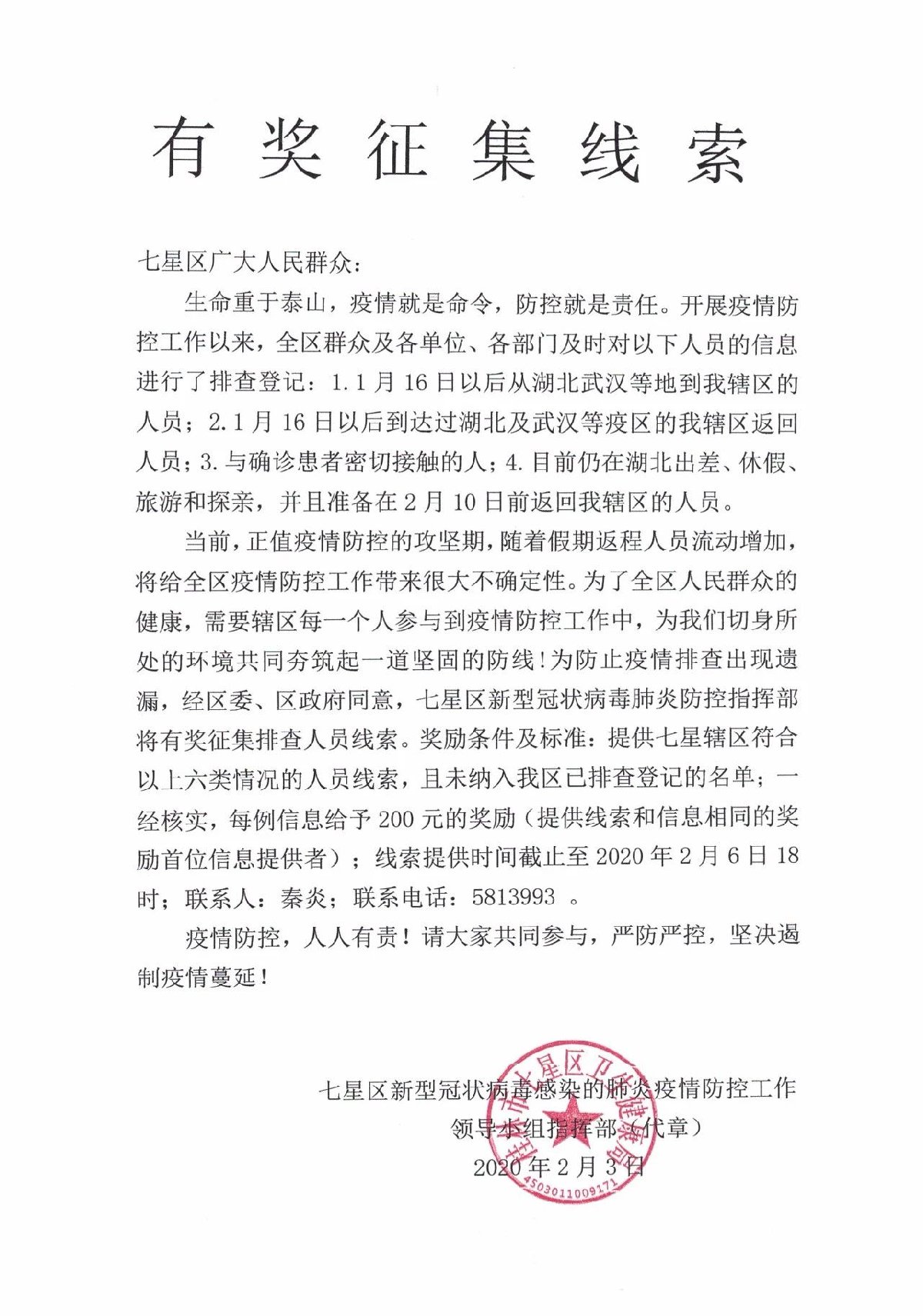 桂林市七星区、象山区、临桂区等区,兴坪、福利、灵川、漠川等乡镇发布有奖举报疫情线索的通告,对提供线索并查证属实的的市民群众有相应的奖励,金额从100元到300元不等。