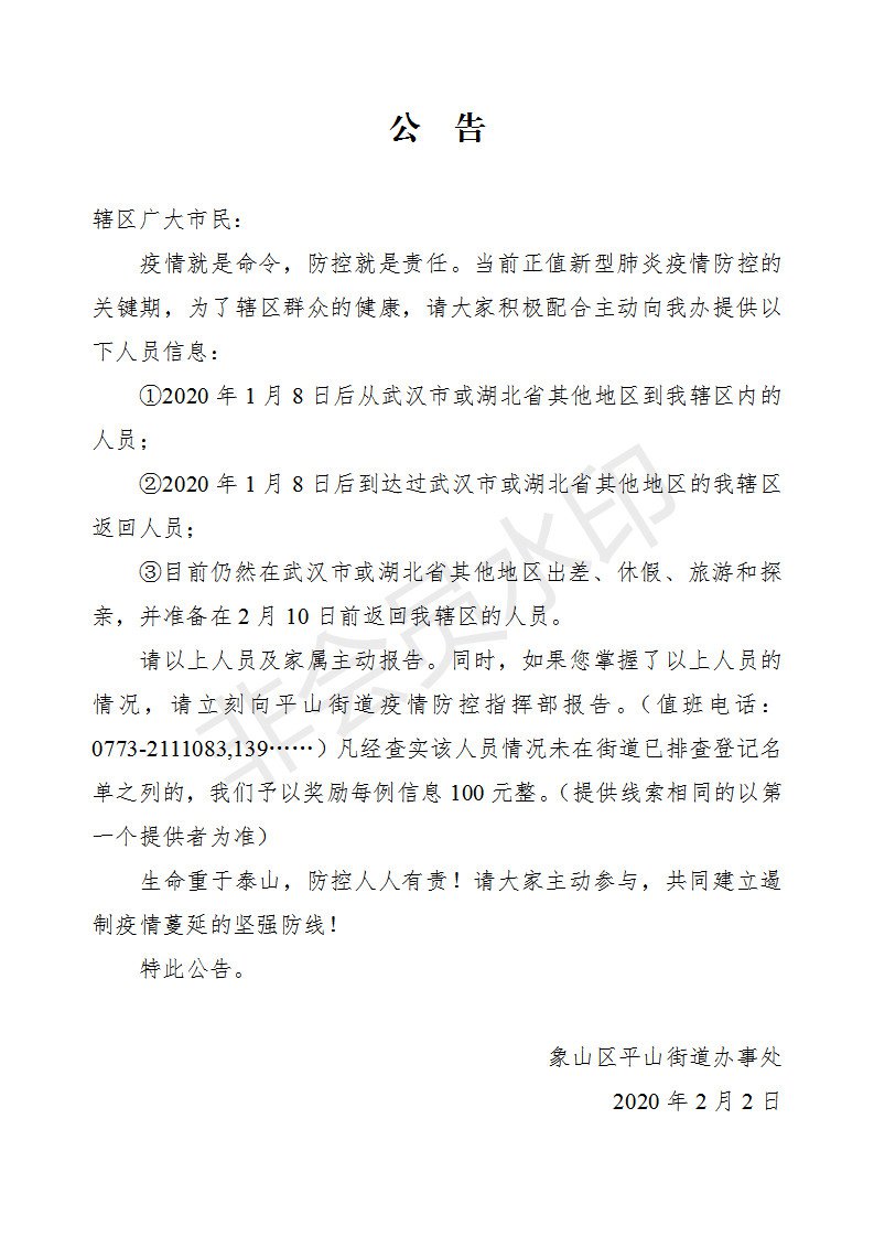 疫情防控,没有人是旁观者和局外人。打赢新型冠状病毒感染的肺炎疫情防控阻击战,需要我们每一个人的积极参与、有效参与。为更加全面、更加有效地做好疫情防控工作,推动辖区社会力量的广泛参与和深度参与,共同保护好辖区人民群众的生命安全与身体健康,秀峰区新型冠状病毒感染的肺炎疫情防控工作领导小组指挥部决定,对积极提供有价值防控线索的居民群众予以奖励。现将具体事项公布如下: