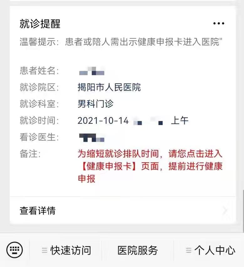 方式二: 预约挂号人员在就诊前一天晚上平台会推送通知,提醒提前申领健康申报卡,方便通行。
