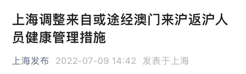 上海市新冠肺炎疫情防控工作领导小组办公室2022年7月9日发布通知,根据疫情防控有关要求,调整来自或途经澳门来沪返沪人员健康管理措施,将之前的7+7改为7+3,,具体措施如下。