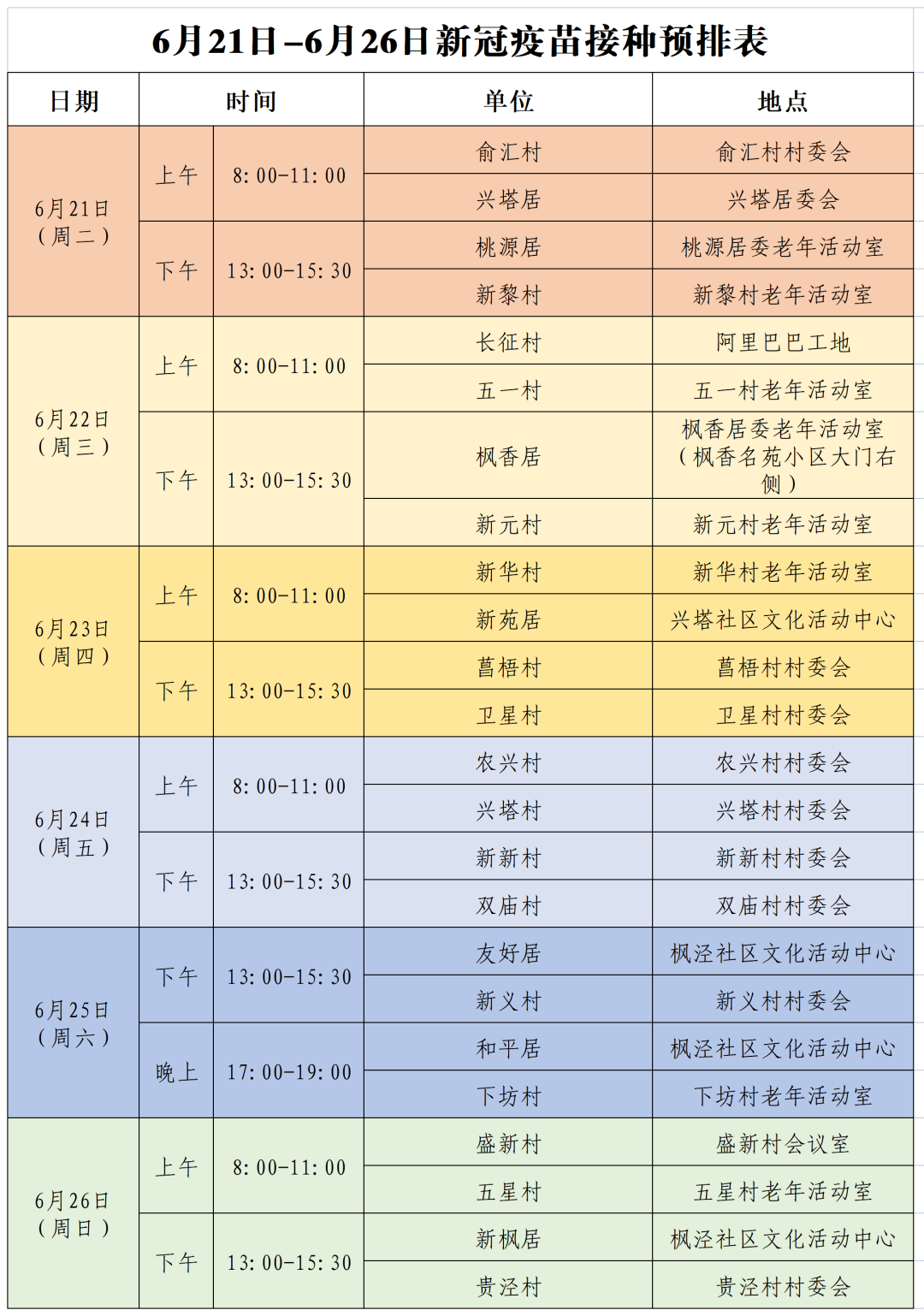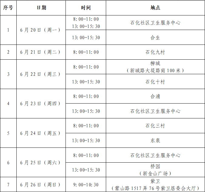 金山区亭林镇老年人新冠疫苗接种安排(6.22-6.26)