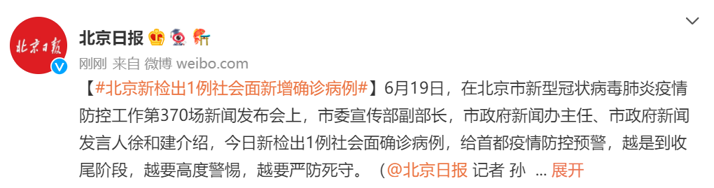 6月19日,在北京市新型冠状病毒肺炎疫情防控工作第370场新闻发布会上,市委宣传部副部长,市政府新闻办主任、市政府新闻发言人徐和建介绍,今日新检出1例社会面确诊病例,给首都疫情防控预警,越是到收尾阶段,越要高度警惕,越要严防死守。