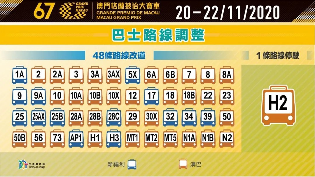 三、11月20日(周五)至22日(周日),每日首班车起至赛道解封时段内,共48条巴士路线改道。