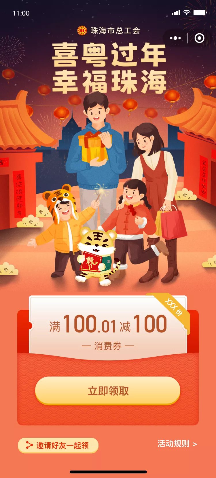 1月26日至30日,市总工会将推出该活动。届时,活动相关小程序每天发放2000张券面金额为100元的消费券,线上晒幸福还有机会获得价值199.99元的话费充值券。