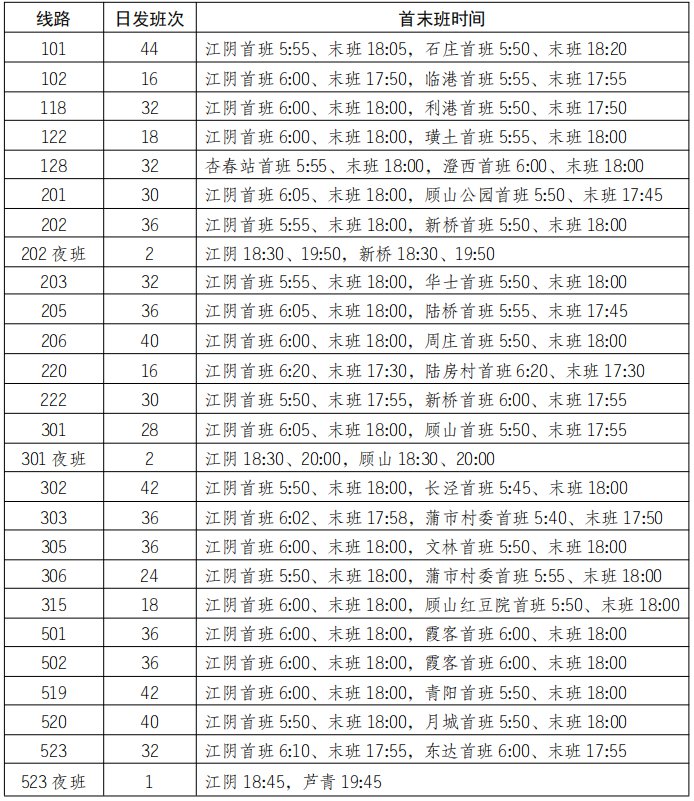 (二)城镇公交。2020年3月30日起,恢复23条主干线路、3条夜班及临港22条、华士8条镇村线路正常运营,主干线路运行时间5:40至18:20。
