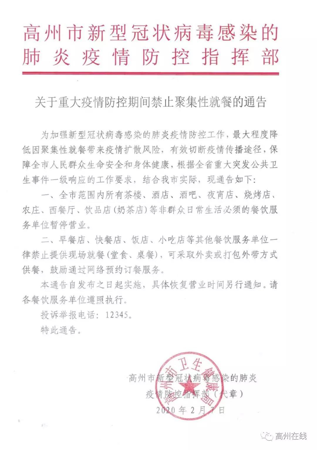 为加强新型冠状病毒感染的肺炎疫情防控工作,最大程度降低因聚集性就餐带来疫情扩散风险,有效切断疫情传播途径,保障全市人民群众生命安全和身体健康,根据全省重大突发公共卫生事件一级响应的工作要求,结合我市实际,现通告如下: