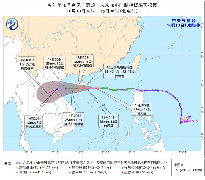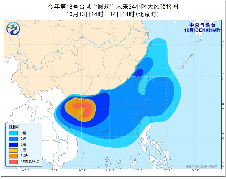 大风预报:13日14时至14日14时,东海西部和南部、台湾以东洋面、台湾海峡、巴士海峡、南海中部和北部、北部湾、琼州海峡、西沙群岛、中沙群岛和黄岩岛附近海域,以及浙江沿海、福建沿海、广东沿海、广西沿海和海南岛及其沿海将有6-8级、阵风9-10级的大风,其中南海西北部、琼州海峡、北部湾、广东西部沿海及雷州半岛、海南岛及其沿海和广西沿海等地的部分海域或地区的风力可达9-10级、阵风11-13级,“圆规”中心经过的附近海域或地区的风力有11-13级,阵风可达14-16级。