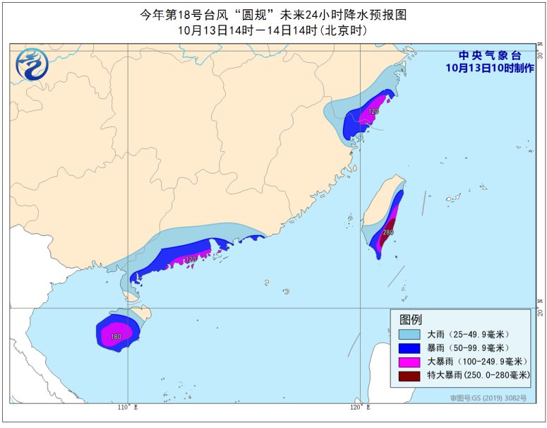 降水预报:13日14时至14日14时,浙江东南部、福建东北部、台湾岛中部和南部、广东西南部、海南岛大部等地有大到暴雨,其中,浙江东南部、台湾岛东南部、福建东北部、广东中西部沿海、海南岛中南部等地的部分地区有大暴雨,台湾岛东南部局地有特大暴雨(250-280毫米)。