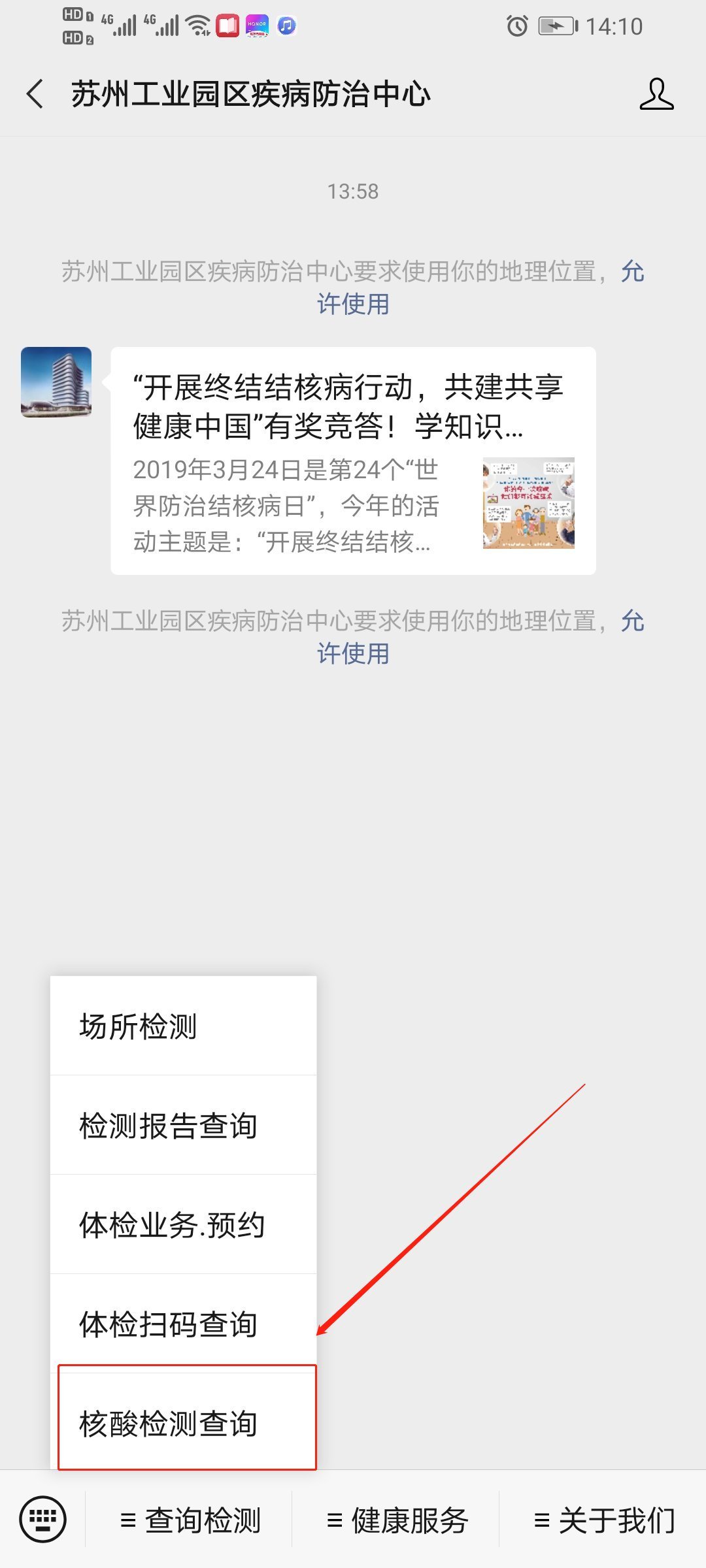 微信搜索“苏州工业园区疾病防治中心”公众号,在公众号下方的菜单栏中点击“查询检测”-“查询核酸检测”进入即可查询。