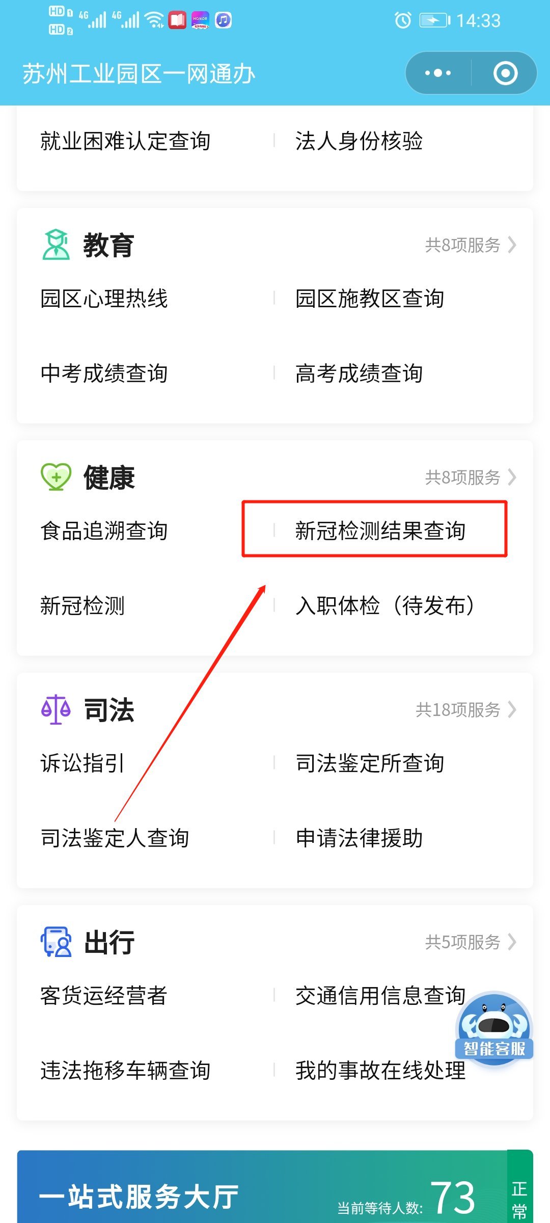 苏州工业园区核酸检测结果查询入口除了苏州大市范围的查询方式:“健康苏州掌上行”APP或“苏州卫生12320”微信公众号、江苏健康通、支付宝健康码、国务院小程序,还有有2个,一个是“苏州工业园区一网通办”小程序,另一个是“苏州工业园区疾病防治中心”公众号,大家按照自己的需求查询即可