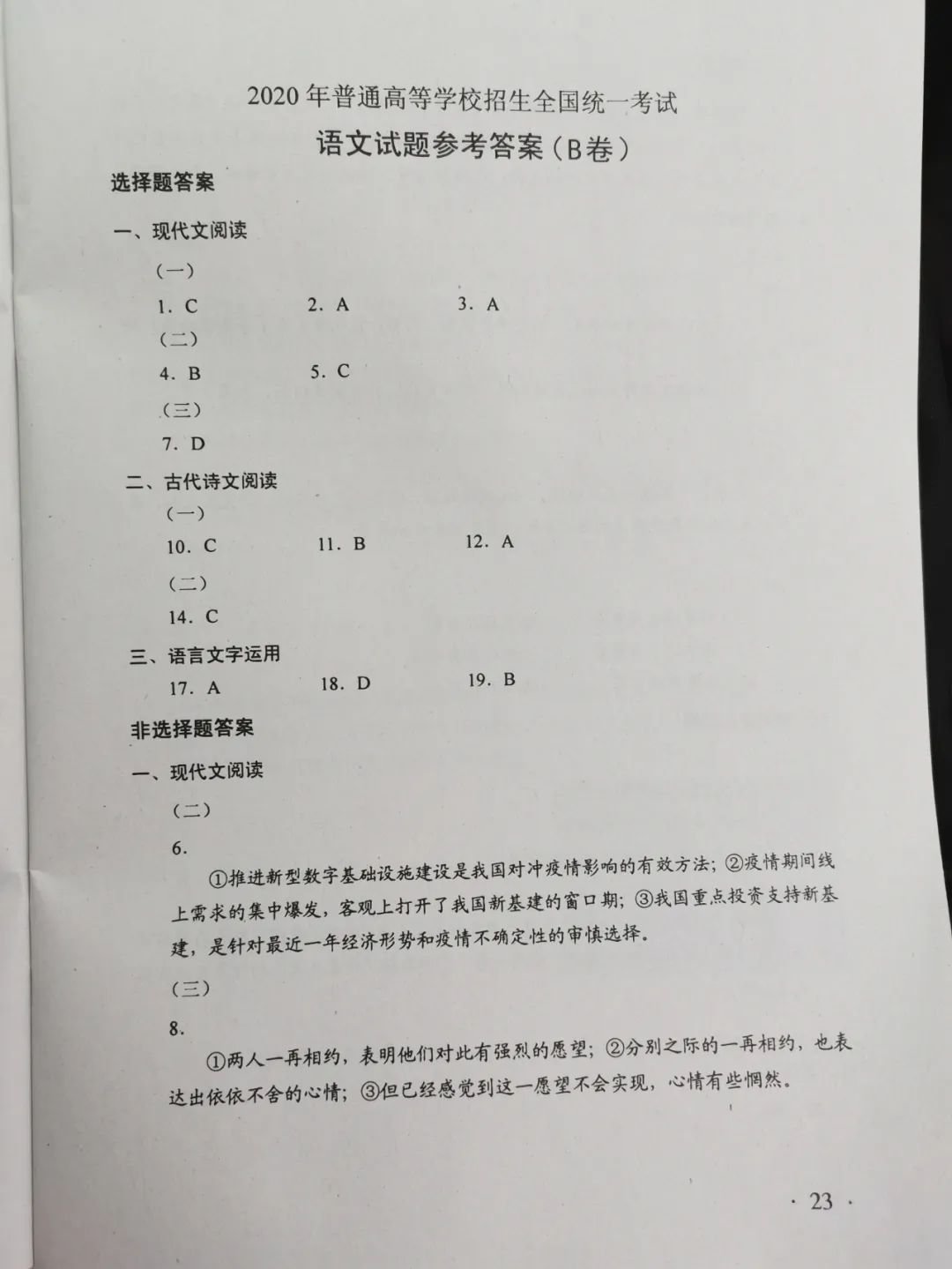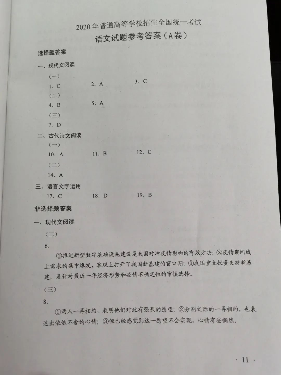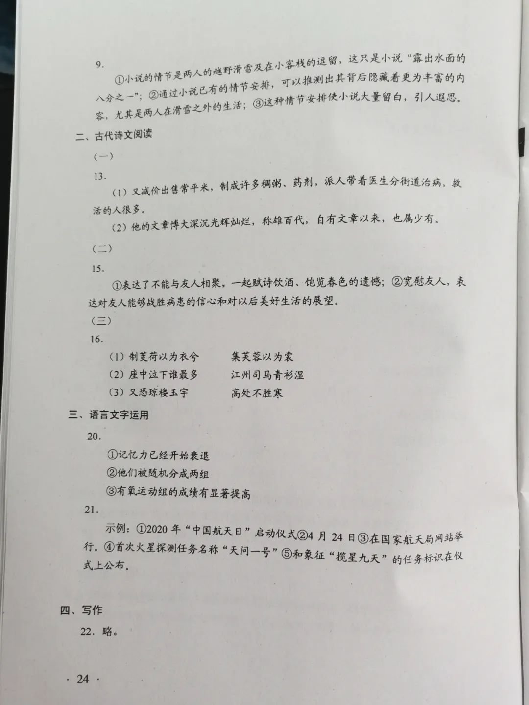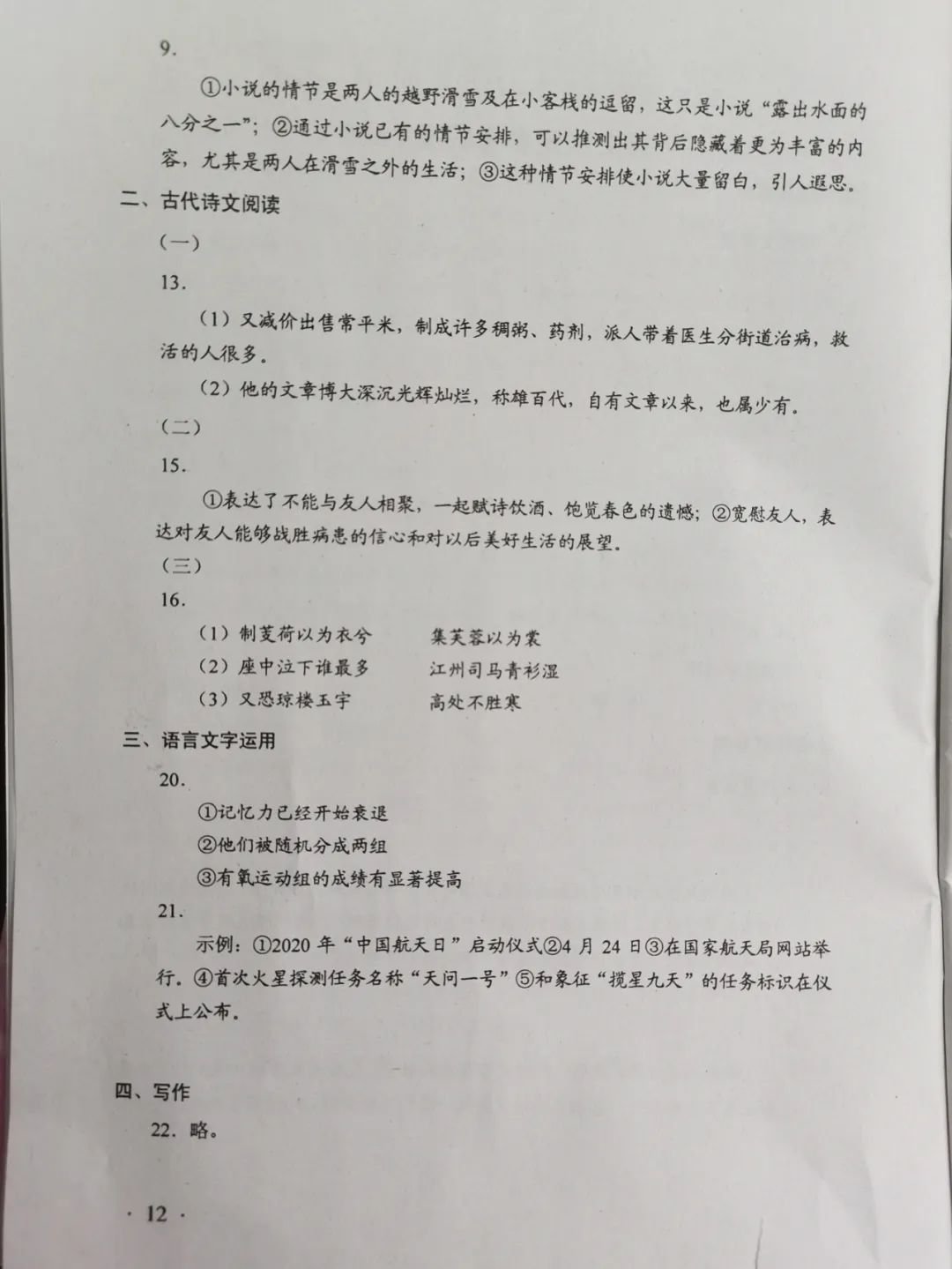 珠海2020高考语文参考答案 珠海中考语文试题2020