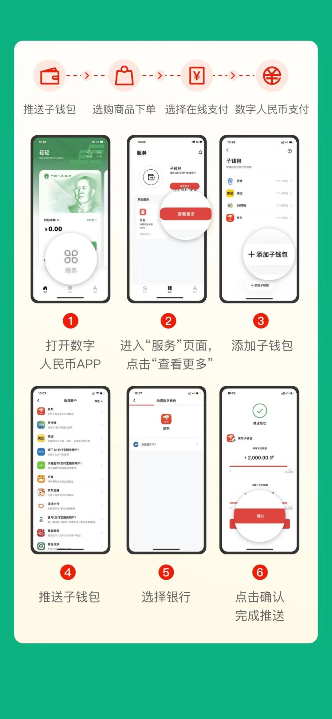 在官方应用市场下载“数字人民币(试点版)”App,开通报名银行钱包后,点击“服务-查看更多-添加子钱包”,选择京东/美团/饿了么子钱包。