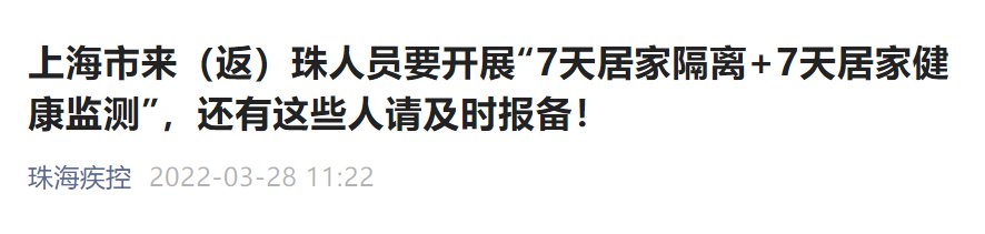 3月12日以来有上海市全域旅居史来(返)珠海人员,需开展“7天居家隔离+7天居家健康监测”!