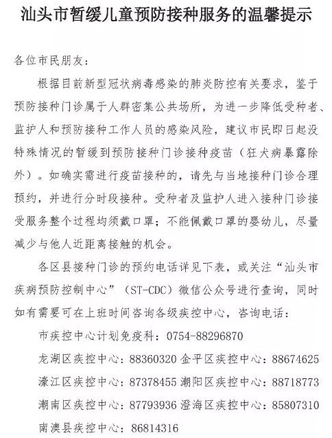 汕头继续延迟门诊接种服务时间的通知