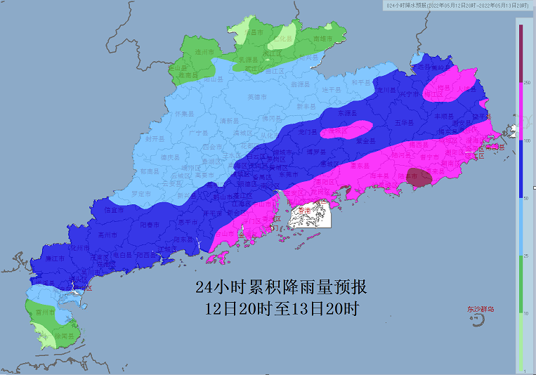 受强盛西南季风影响,5月11日00:00~18:30全市普降暴雨到大暴雨。 其中斗门西部、香洲和高新沿海更是出现特大暴雨 最大雨量出现在情侣北路,355.4毫米。