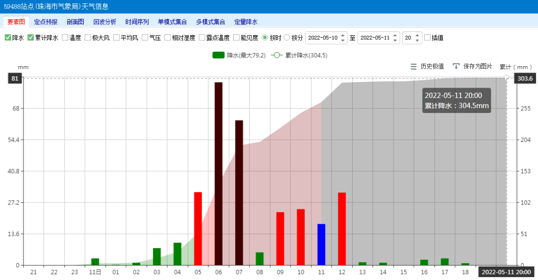 5月11日早晨,珠海也挂起了2022年首个暴雨红色预警, 全市不管大中小学都放假一天,降雨分布也极不均衡,老香洲的珠海国家气象观测站。截至19时,累计雨量达到304.5毫米, 比新香洲和前山多了一倍。