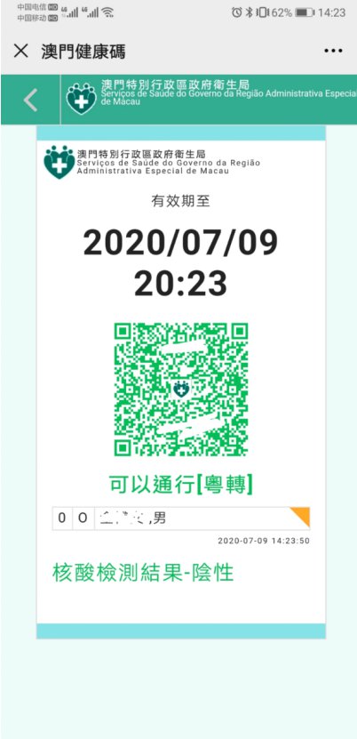 由“粤康码”转码的澳门健康码(带“粤转”字样)